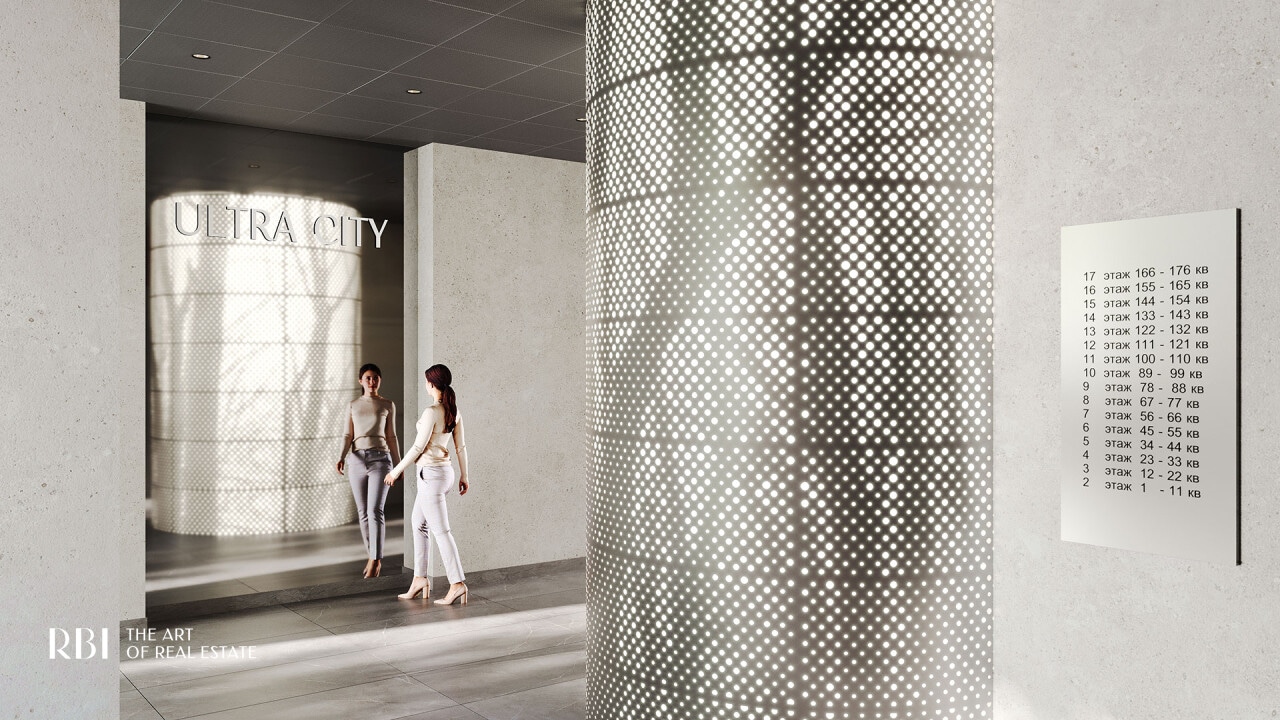 Сочетание терракотового и оливкового цветов в интерьере входных групп продолжает палитру, которая формирует внешний облик дома. Бесшовная визуальная среда гарантирует комфорт и уют, а детали декора - перфорированные световые колонны - создают яркие акценты. Колонны будут украшены флоральным узором, который перекликается с фруктовой аллей Ultra City 3.0.
